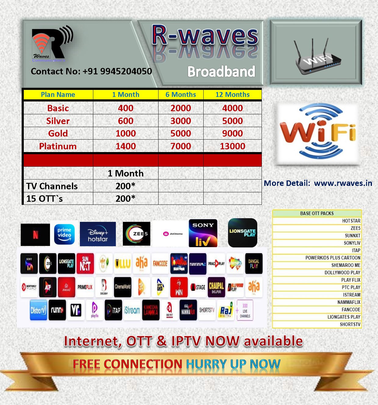 We Rwaves Broadband Currently providing Hi-Speed Broadband Services and 24x7 Support For customers in Mudhol Dist Bagalkot